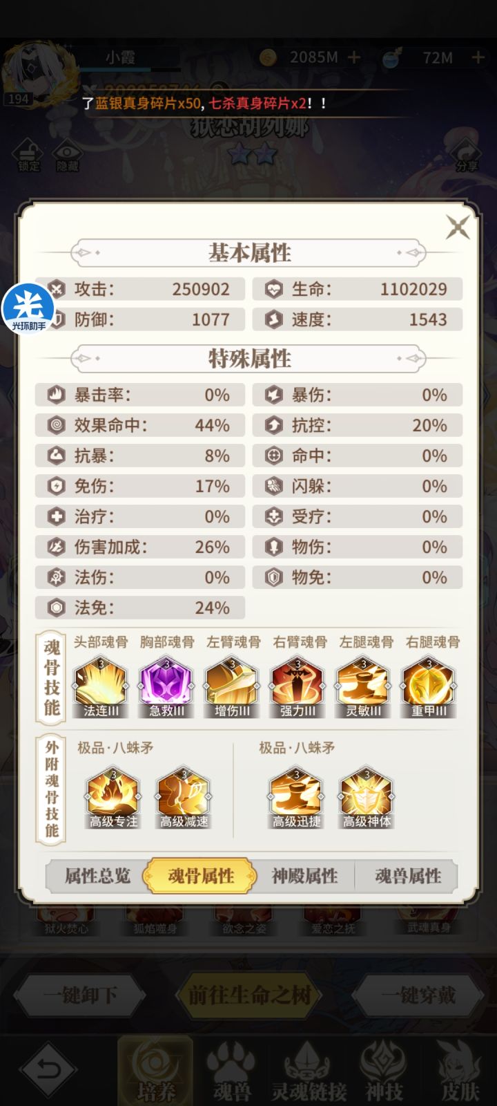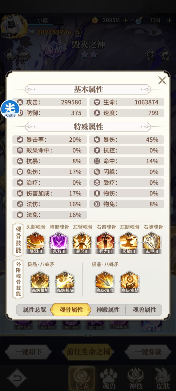 魂骨:如上图(左臂有条件换成爆怒副词条优选爆伤或者物伤,腿的话打暗猫换玄甲打天使光虎换成重甲即可)