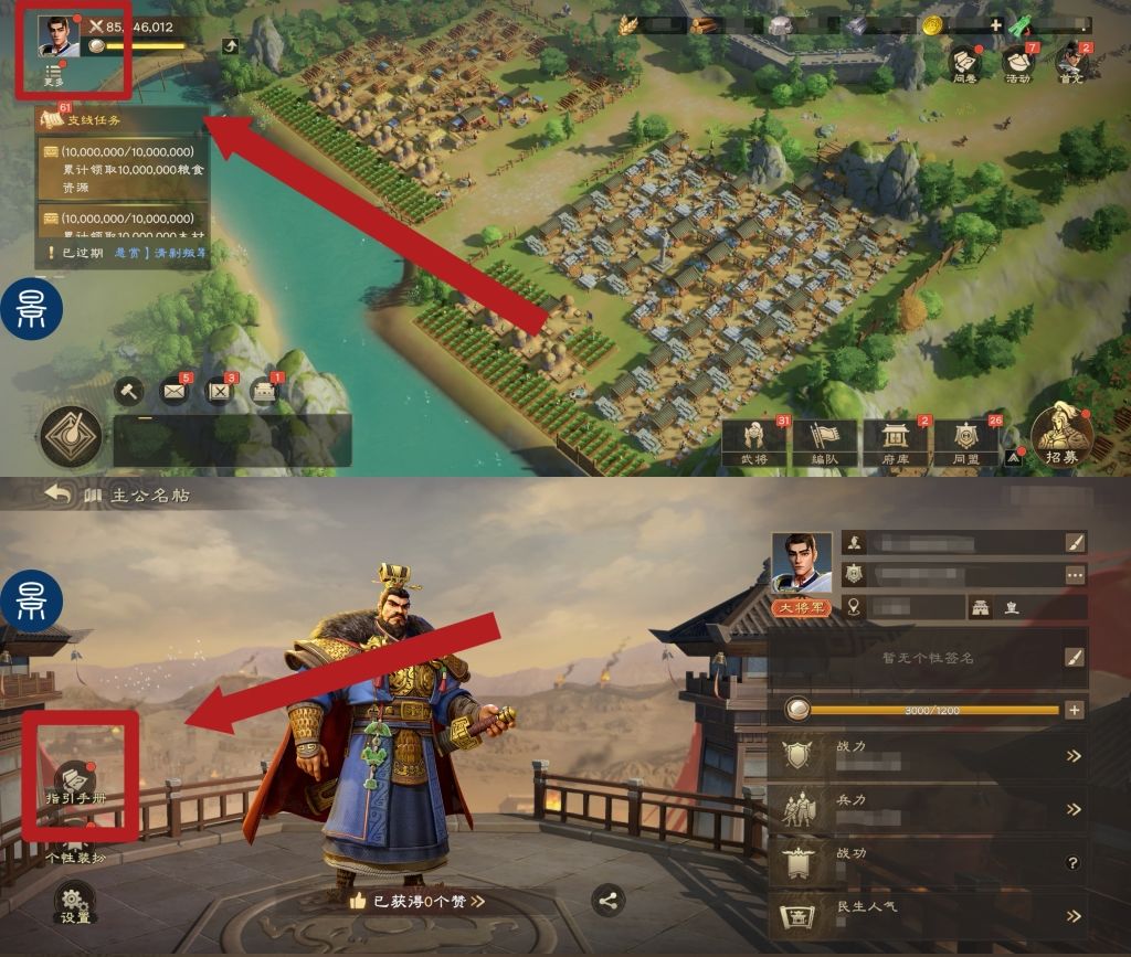 主公在《偃武》中征伐天下时,若对其中部分规则不太明晰,也可点击头像进入主公名帖界面,再点击左下角指引手册,即可进入了解~