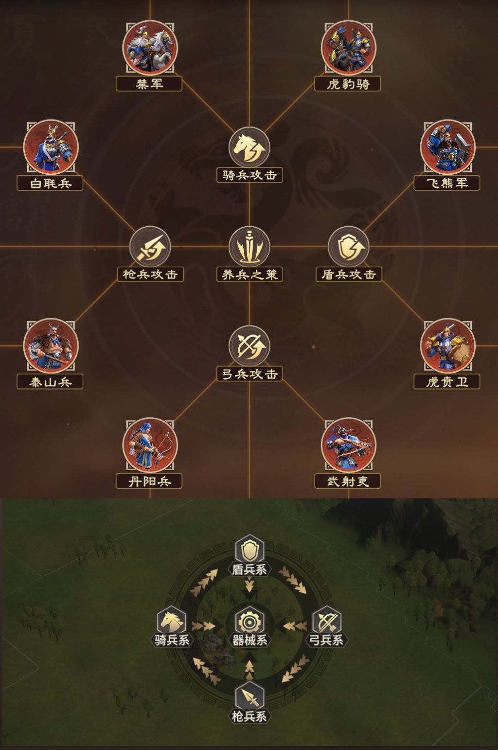为满足战争需要,制作组为主公制作了多种兵种,并在其下进一步扩展了士卒类型,但大体上分为骑兵、盾兵、弓兵、器械、枪兵。所谓闻道有先后,术业有专攻,各种兵种也由此形成了克制关系,使得克制方能够额外提升伤害与防御。