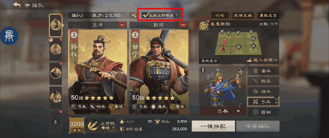 主公也可以在编队配置界面选择要立即释放的主将技能,这样便可分出精力来进行战场的其他排兵布阵内容。