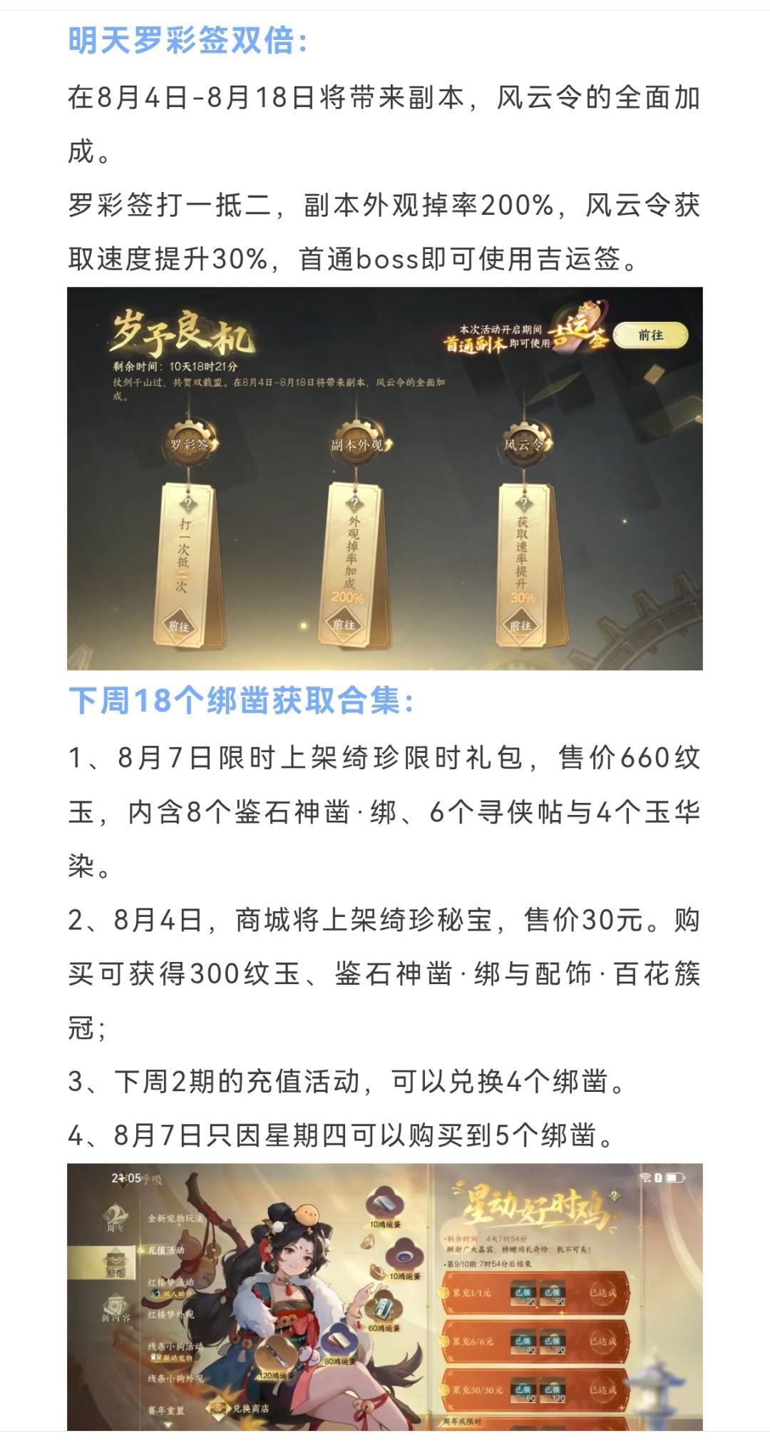 逆水寒明天罗彩签双倍+144块新时装,下周18个绑凿获取合集,EVA联动6套时装,世界首领掉落141级装备!