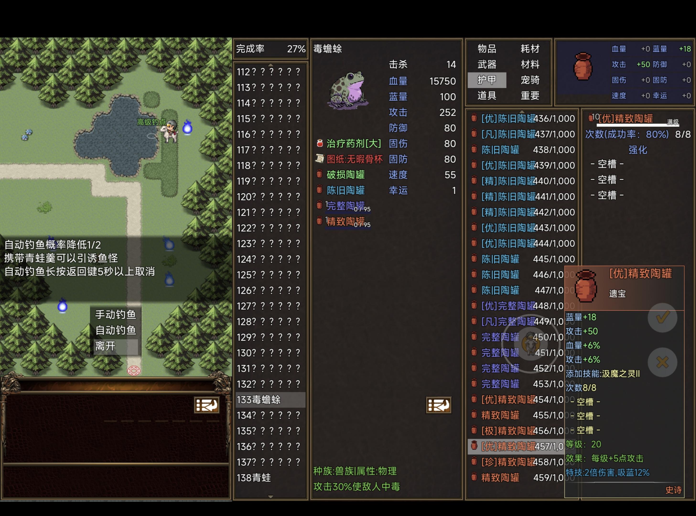 14、如何钓鱼:需要解锁松林镇地图,进入松林镇左上方渔场购买鱼竿和鱼饵,渔场可钓水草、小鱼、遗宝、青蛙(消耗鱼食),野外池塘可钓水草、青鱼、遗宝、蟾蜍(消耗青蛙羹)