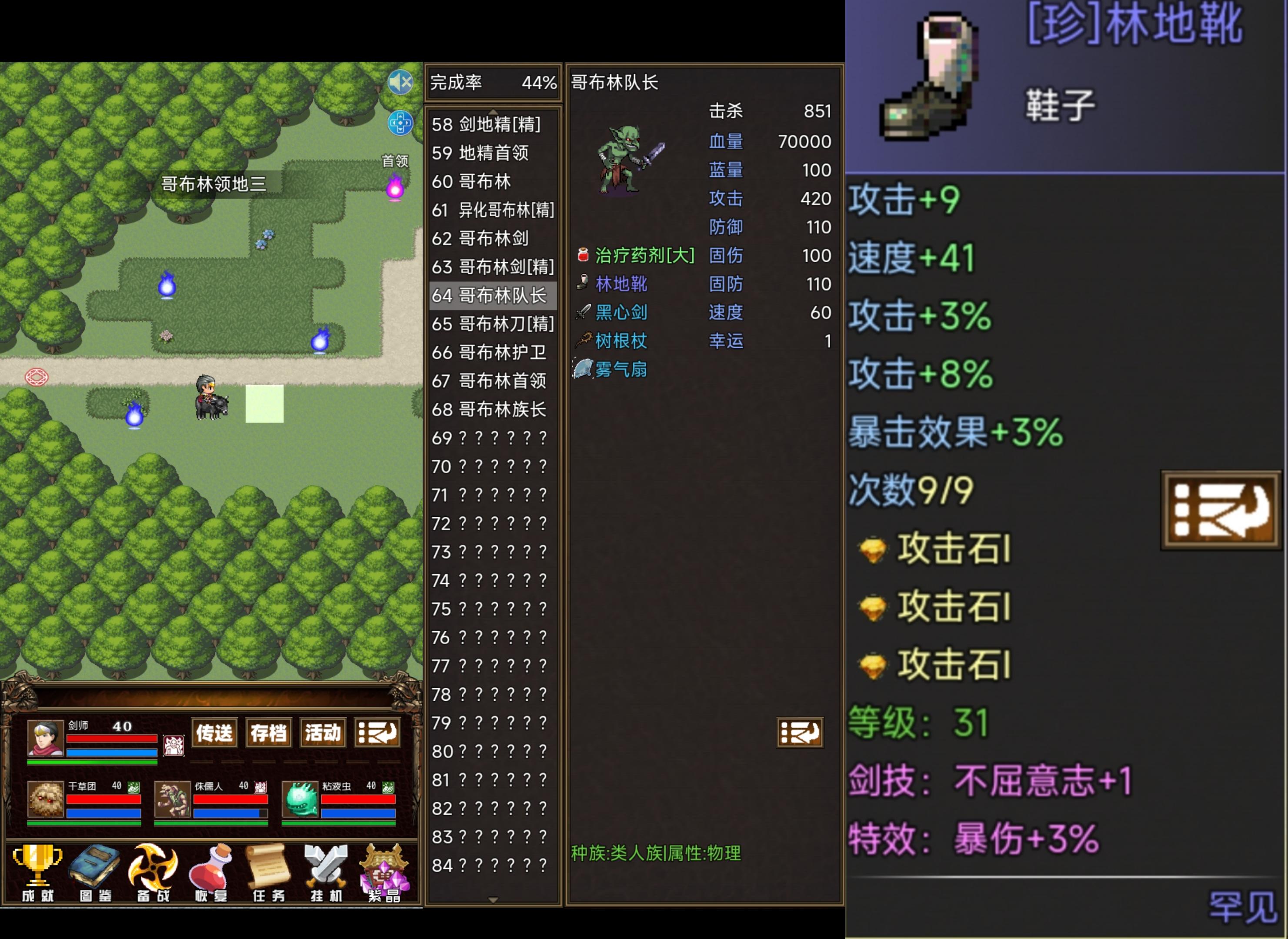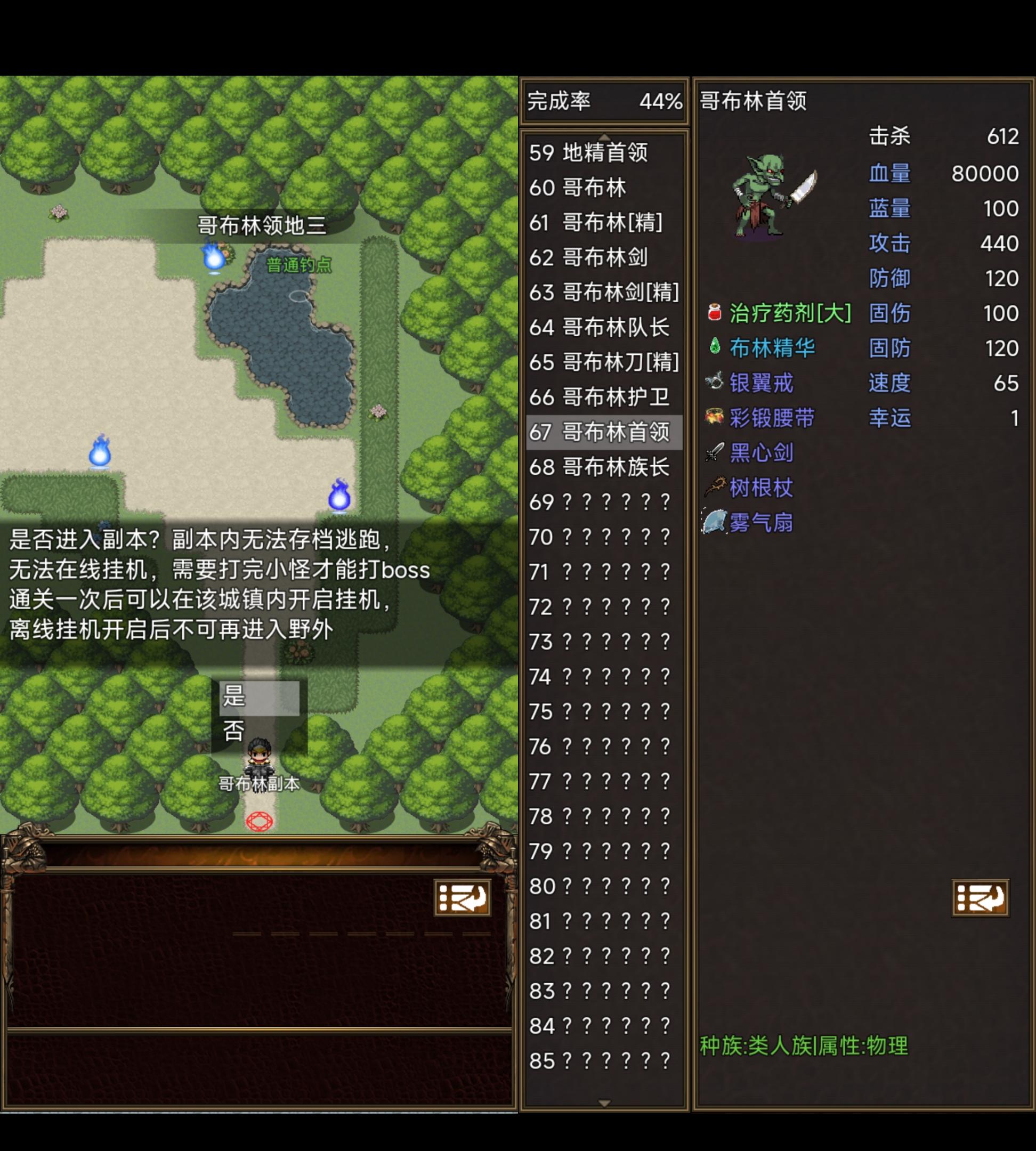 穿戴遗宝装备,从松林镇-往右-往右-往上-往右来到北林副本入口,存档进入,尝试击杀三次boss完成守卫队长任务(奖励技能书),(如果打不过可以回前面副本练级、刷装备),通关一次解锁北林副本离线挂机功能,紫色项链戒指是目前图二最好装备,离线挂机可在此副本和10级秘境中二选一(下个副本目前打不过)