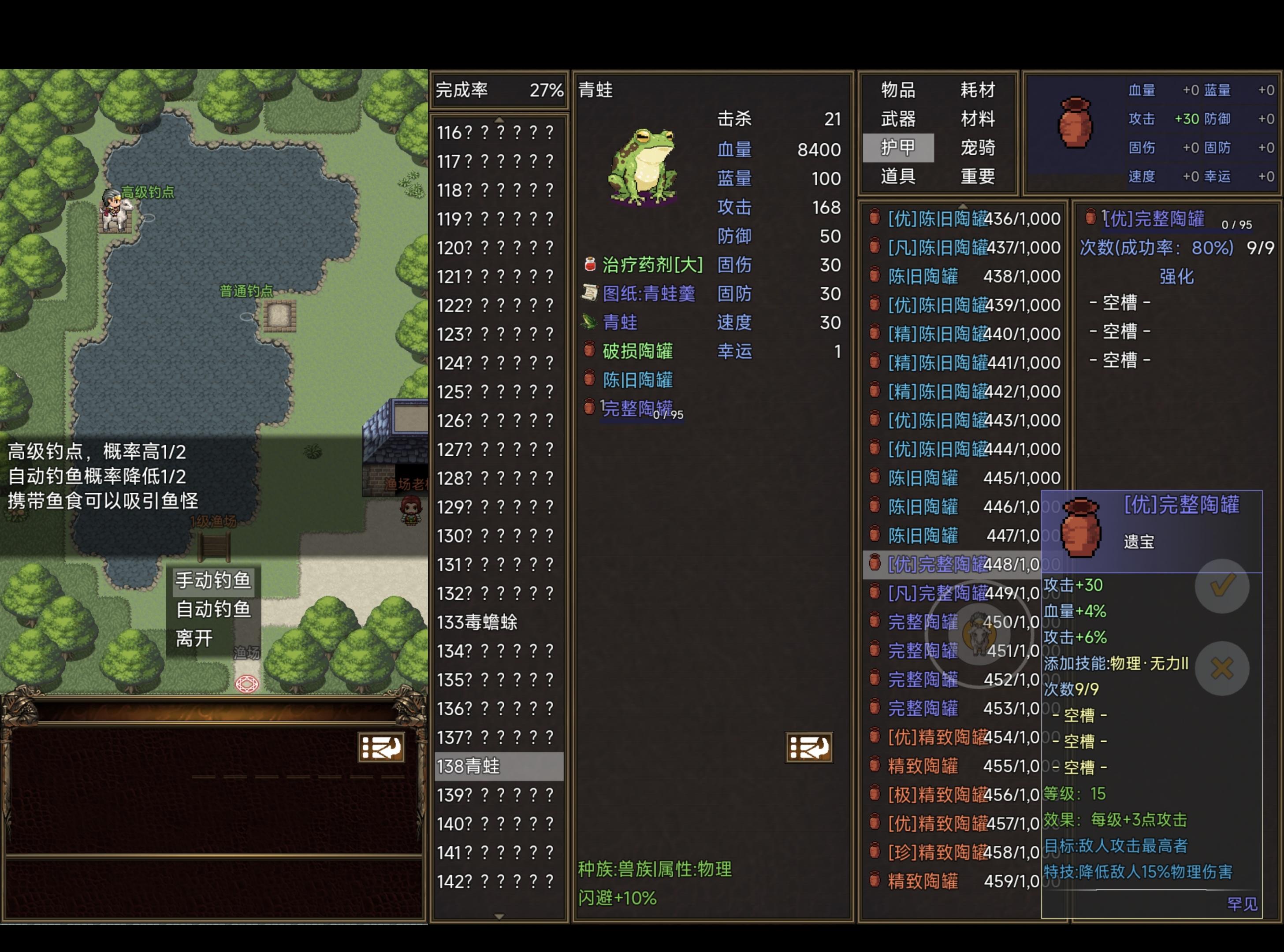 (1)遗宝装备:钓鱼、尝试买鱼食在渔场钓青蛙sl紫色遗宝(可升级,每级提升攻击力),钓取携带减治疗、开局增伤技能的遗宝
