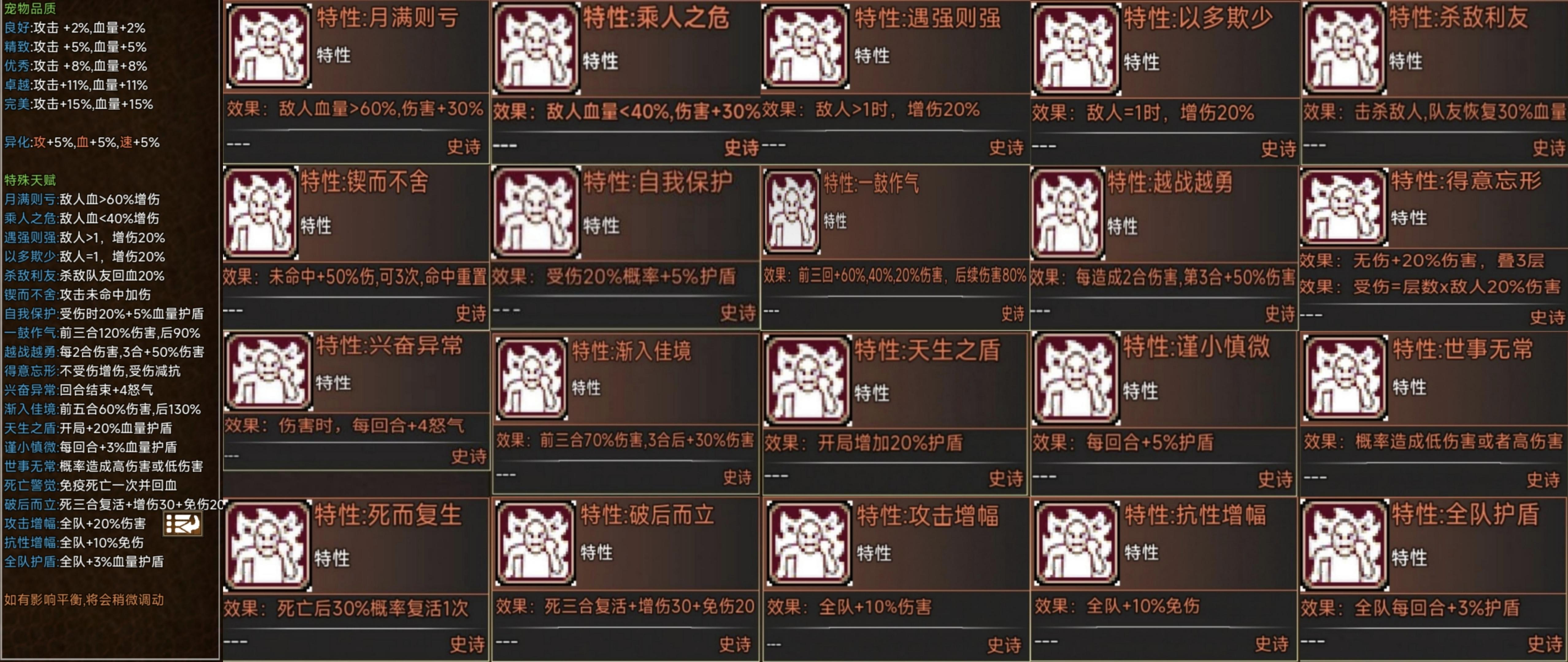 孵化的普通宠物最多能有4条特性,包含一条品质(良好/精美/..)、一条异化(攻/血/速)、两条特殊天赋,特性丹可提升特性数量上限(紫晶商店、深渊等获取)