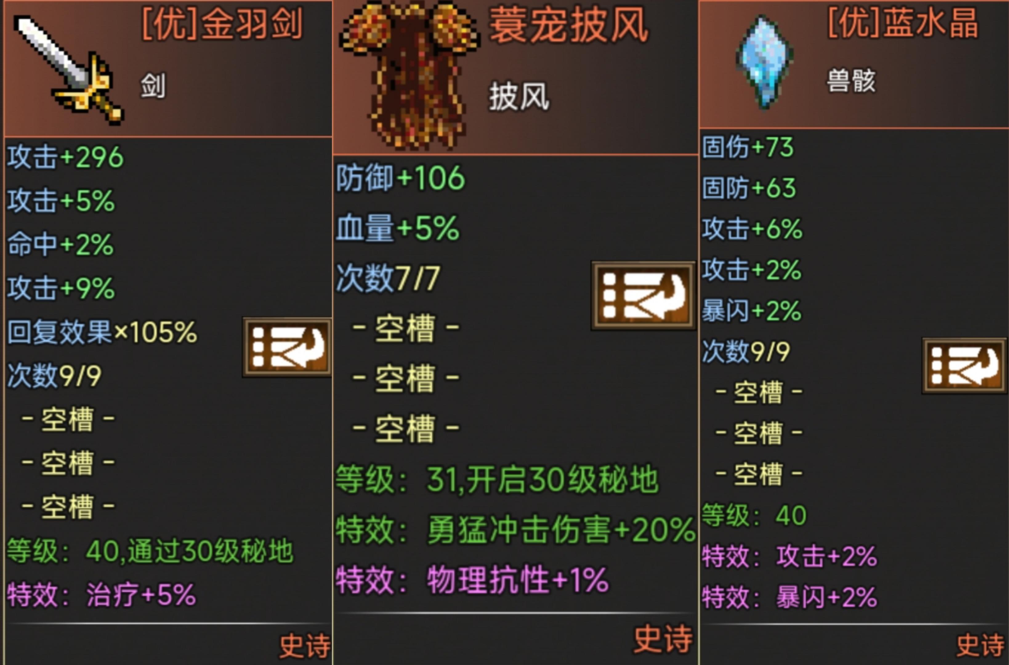 10级秘地刷出四套橙武、四套赤色角、四套腰带初步毕业,可以前往下一个北林副本轻松刷取项链、戒指(也可以中途前往),后续20级秘地boss卡关时,再返回10级秘地刷取前缀更好的(优、珍、极)装备替换,以及带强力技能的武器(连刺、乱击、汲血:造成2次0.8倍攻击伤害,如果佩戴50%对应技能伤害加成的兽骸,相当于2.4倍系数伤害,且无cd无蓝耗),隐藏红武可遇不可求,早早拿到基本畅通无阻到达20级秘地前,补刷一点装备能过20级秘地,没有红武就对其余装备要求更高,群内出红武在10至1300+次副本范围内