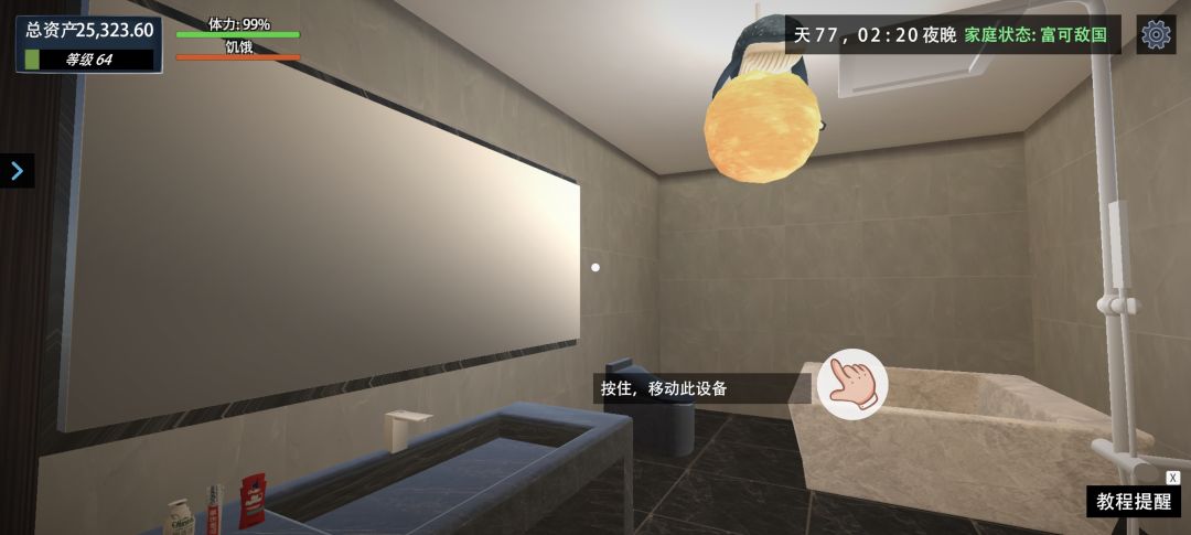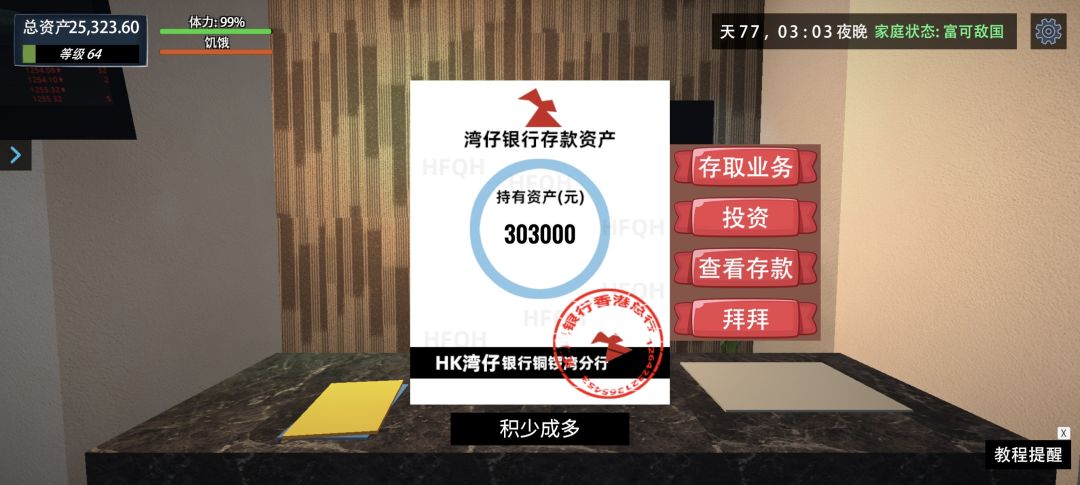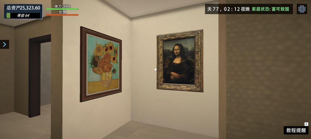 没算家居花了多少,但光是名画就15w➕了,其他家居也买的都挺贵的,粗略算下来就差不多按25w来说吧,图左上角手中现金2.5w,银行存款如最后一张30w,加在一起77天净利润60w左右,应该还会多点