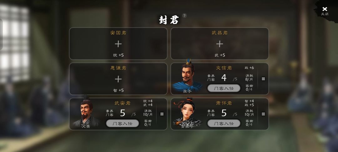 你封过的君会豢养门客,门客到达一定数量后会有门客出仕。出仕的门客会大致分为武将和文臣两类,并且有机会出仕女将(概率较低)。
