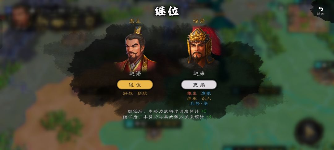 势力好感度:继任者的政属性越高,继承后势力好感度越高。
