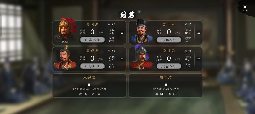 另外,君的四维越高(四维收益顺序:政→统→智→武)可豢养的门客就越多(最低5,最高100)。