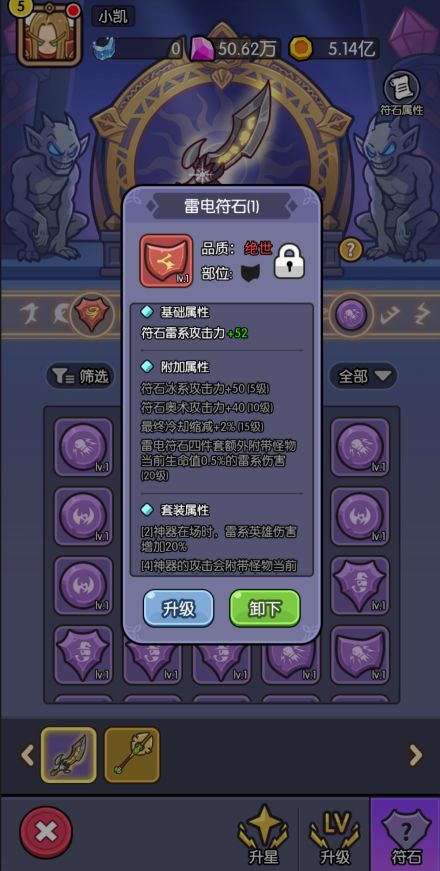 3、符石升级:符石通过消耗符石本体来分解升级,提供升级所需经验。也可以通过不消耗本体的置换升级来转移符石内的经验。