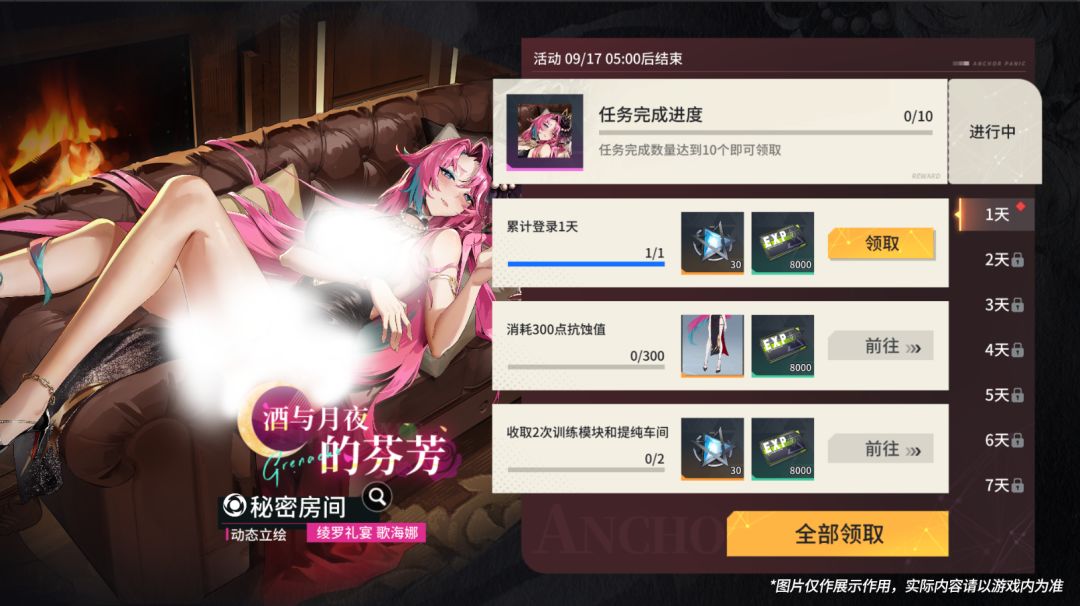 活动规则:3.0 版本更新后,每日将解锁新的活动任务。链尉官只需在活动期间完成指定数量的任务,就能免费领取歌海娜全新换装【秘密房间】及其部件【秘语·星芒】哦~