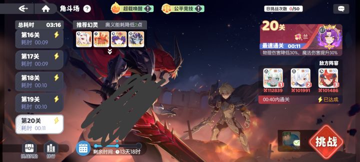 打20关要想打快的话需要荆在哈迪斯分身还没放出来前就把她打死,这样能快个1~2秒。荆练度低不能秒哈迪斯的就带4攻击或2攻击2暴击(看运气暴击)一般就能秒了。