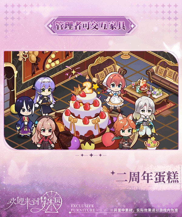※套装说明:内含管理者可交互家具「二周年蛋糕」,将其摆放至乐园宿舍中时,管理者与各个角色可一起与该家具进行交互