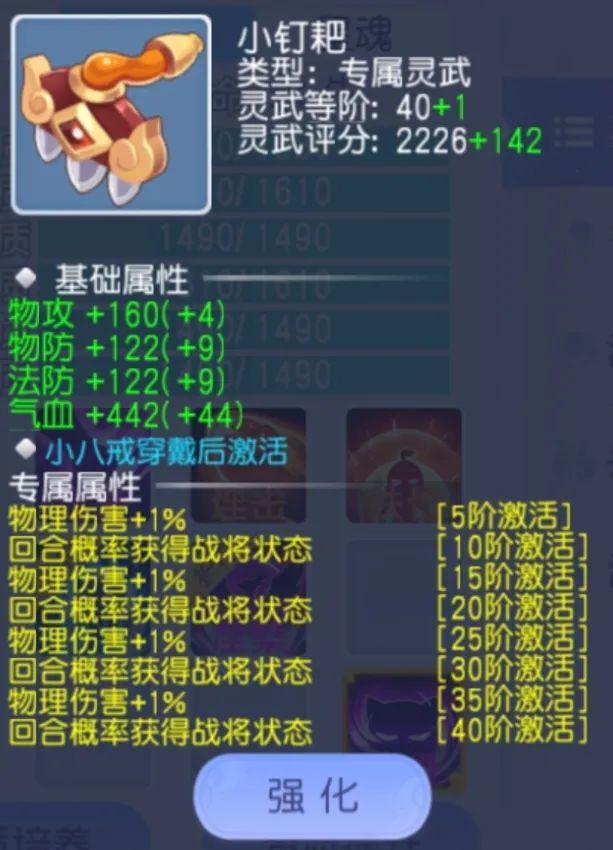 专属灵武——小钉耙,回合概率获战将状态,加速被动效果叠加,快速叠满。