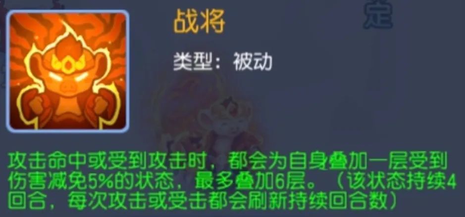 小八戒被动技能“战将”,攻击命中或被攻击时,自身叠加一层伤害减免5%状态,最多6层,最高可叠加30%。