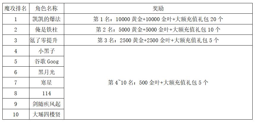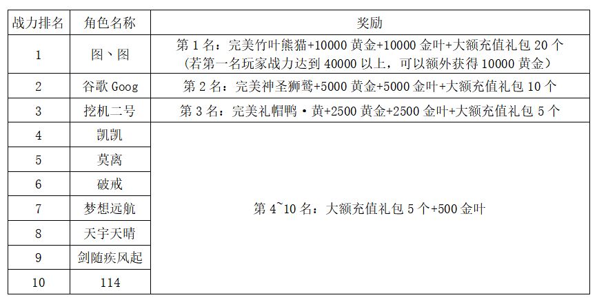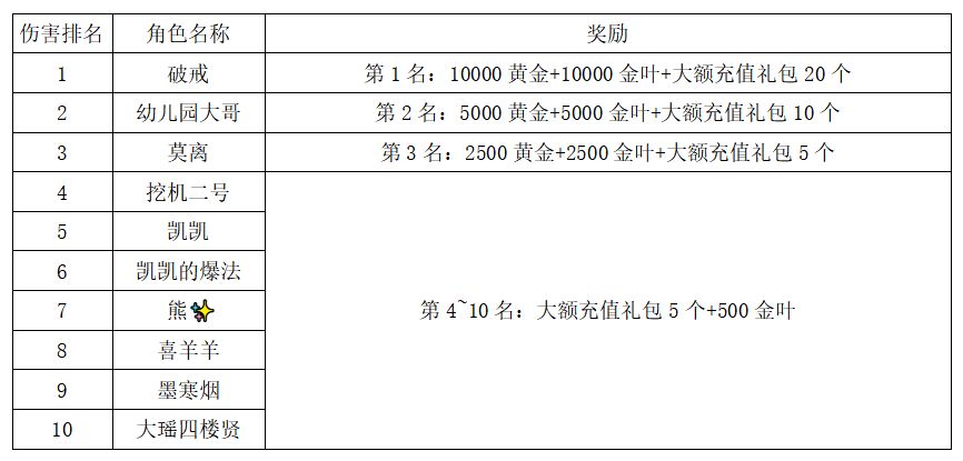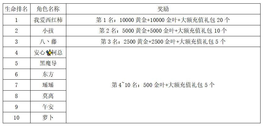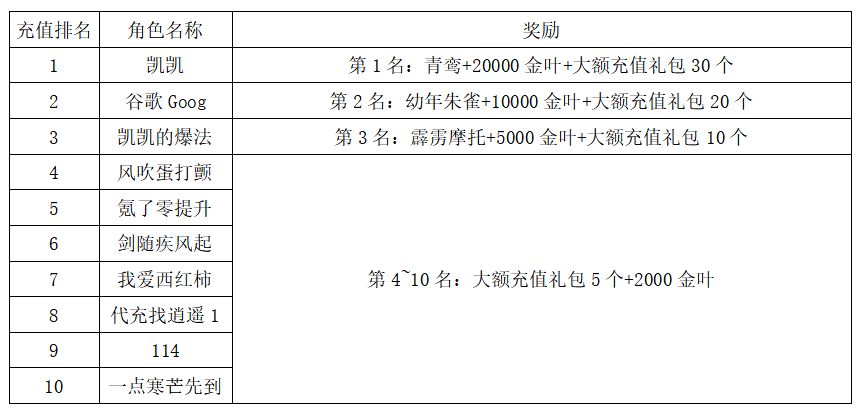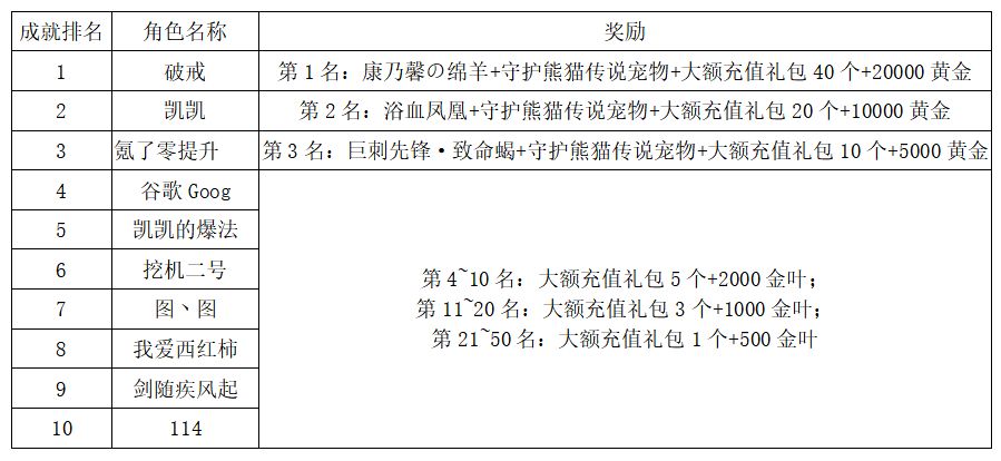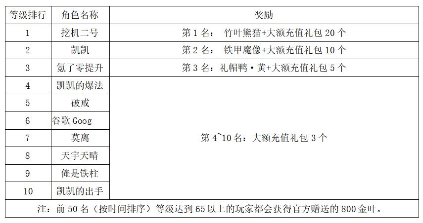 注:以上活动排名均以服务器时间为准。新区排行榜活动如发现存在违反游戏相关规定使用游戏外的辅助工具进行作弊将取消获奖资格。