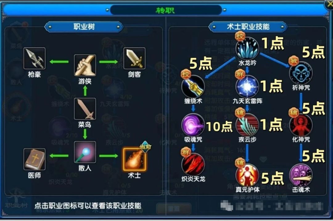 标准加点推荐:水龙吟1点 祈神咒5点 化神咒5点 击魂术+5点九天玄阵+1点疾风步+1点真元护体+5点缠绕术+5点吸魂术+10点输出加点推荐:水龙吟1点 九天玄雷阵1点 祈神咒5点 化神咒5点 击魂术1点缠绕术5点 吸魂术10点 炽焰火龙10点第二套技能需要在散人加点时有所调整,在散人职业中御剑术1点,紫气东来8点升级之后增加伤害的范围,医疗术1点,回春术3点。