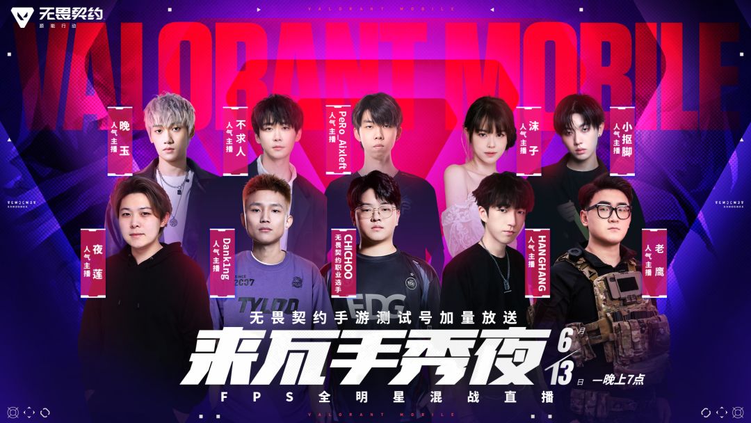 6月13日同步官宣FPS全明星阵容「来瓦手秀夜」直播,CHICHOO、HangHang、DANK1NG、夜莲Annbbers、左梓轩_Xleft、不求人_水瓶座entp、沫子Mozz、晚玉阿、狙神小抠脚,以及主播老鹰均参与了此次直播活动并进行实战展示。其中,XDD与晚玉在比赛中表现亮眼,斩获MVP。