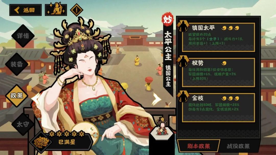 目前评价:一政策对于士子需求量过大,目前只有在能够自己造以及搭配上官婉儿的情况下,勉强可以获得收益,二政策有成为全女名臣阵容核心的潜力,但是目前相关搭配较少,未来可期。三政策正面收益一般,负面影响目前看来有些大,可能需要一些其他百分比降消耗的名臣配合。