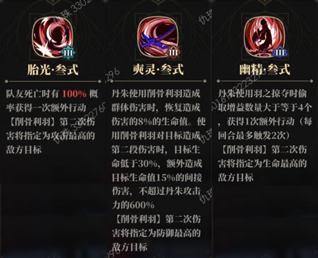 幽精:追击伤害指定生命最高的目标;偷取4个增益效果时即可触发连斩,我方无其他输出类角色为丹朱提供收割环境时,丹朱本人就可以稳定触发连斩效果,此时推荐携带奇术3;