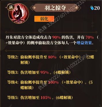 【羽之掠夺】:对敌方全体造成伤害的同时有一定概率偷取增益效果