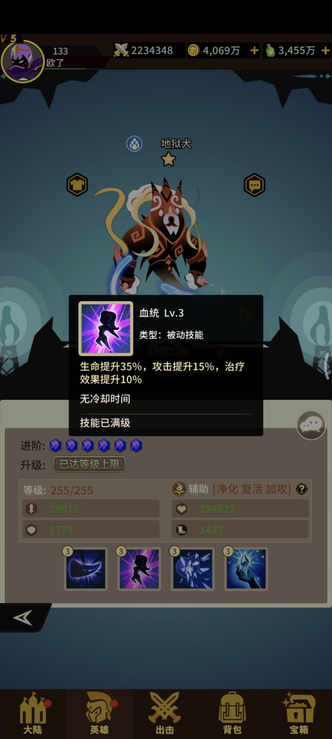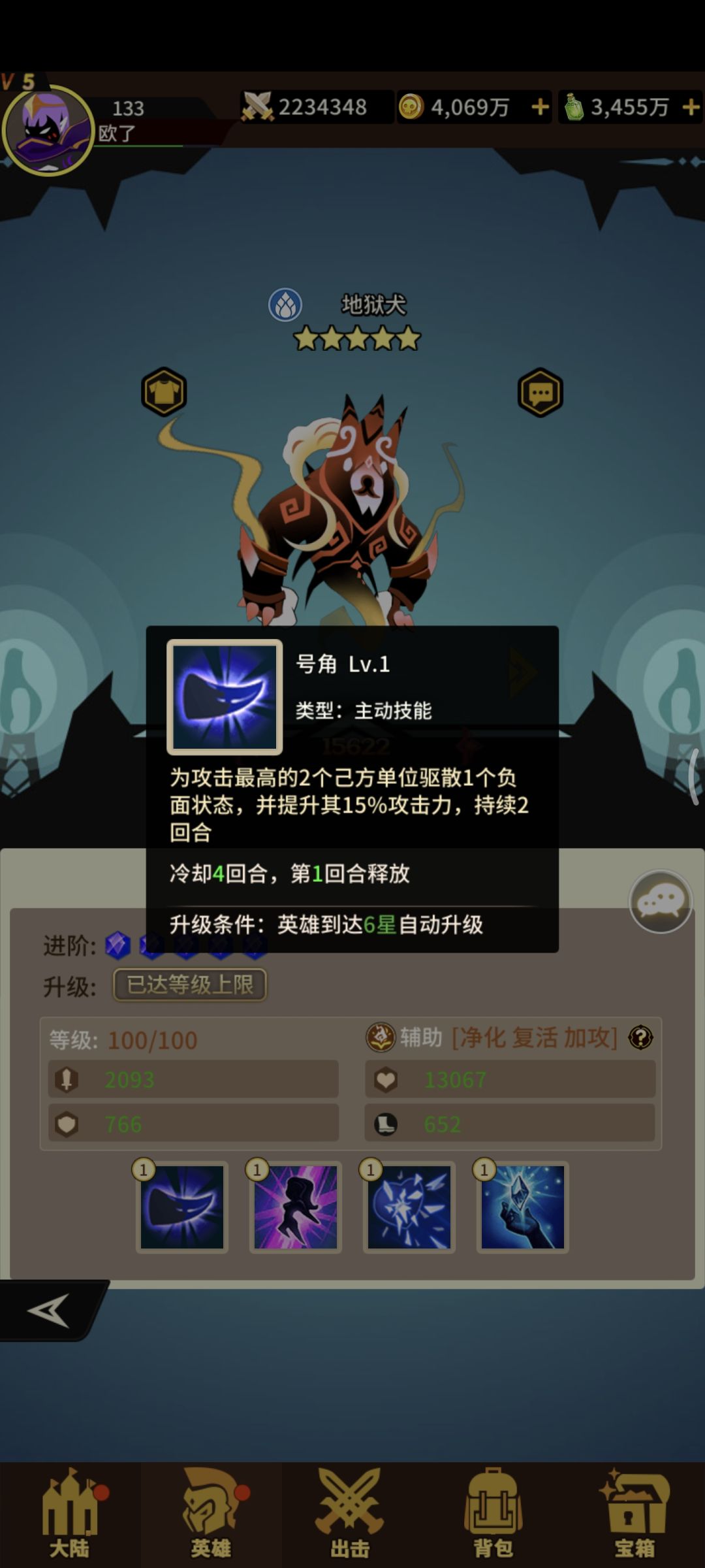 水系辅助小奶狗四技能!获取难度容易!抽卡+宝箱+兑换!一技能为攻击最高的两个队友驱散负面状态+攻击力两回合!!二技能+生命+攻击满级+治疗效果 三技能复活单体回复生命力!没死亡给最低单体+生命!四技能强化一技能提升目标暴击率!