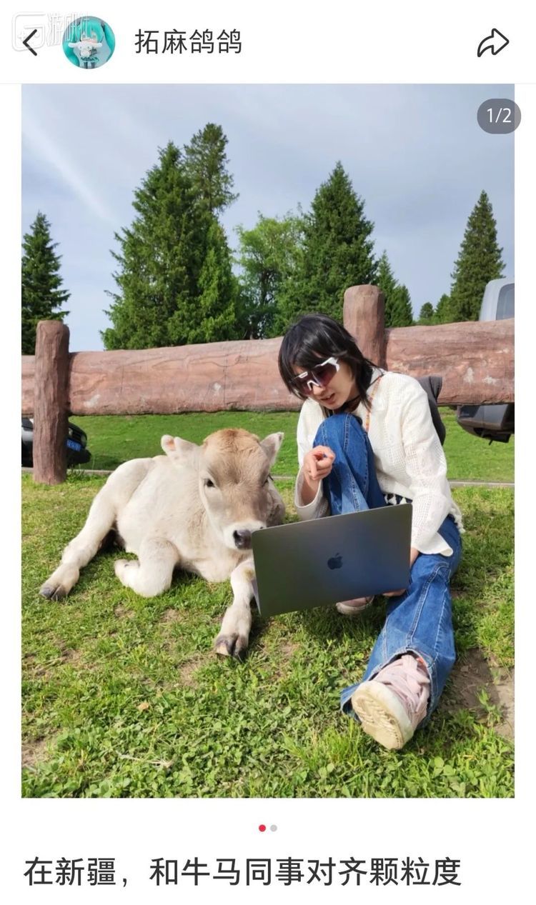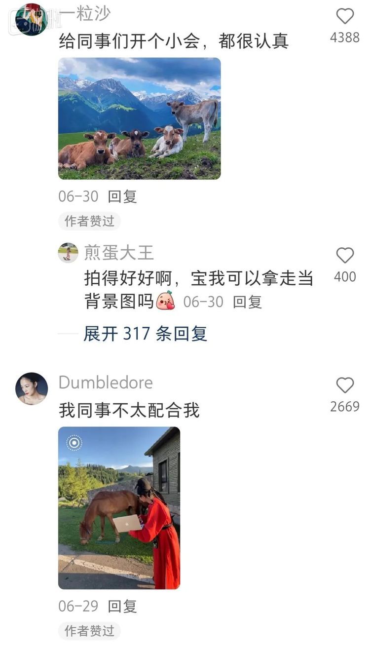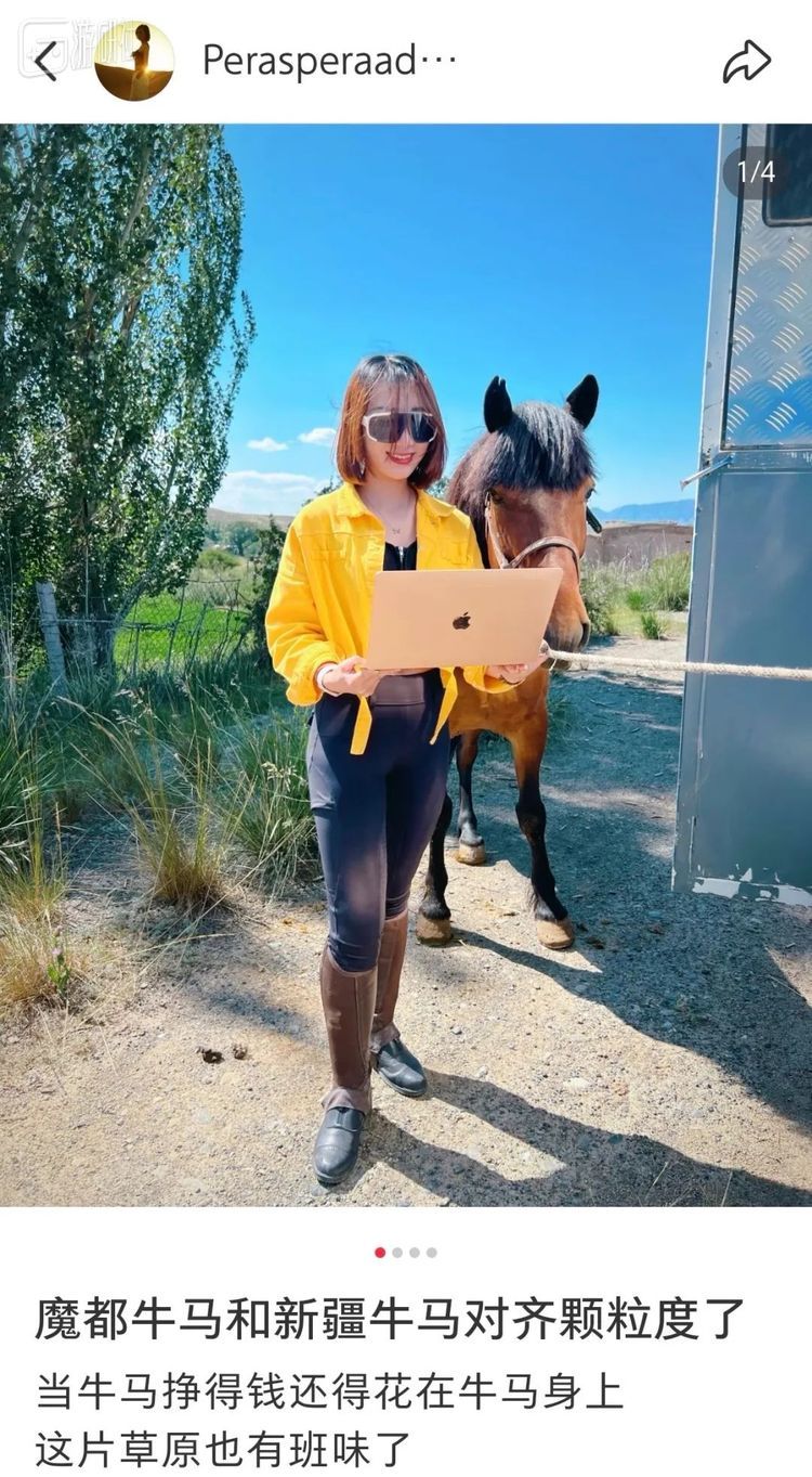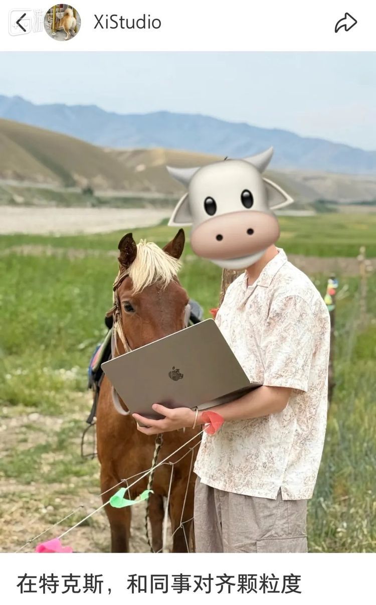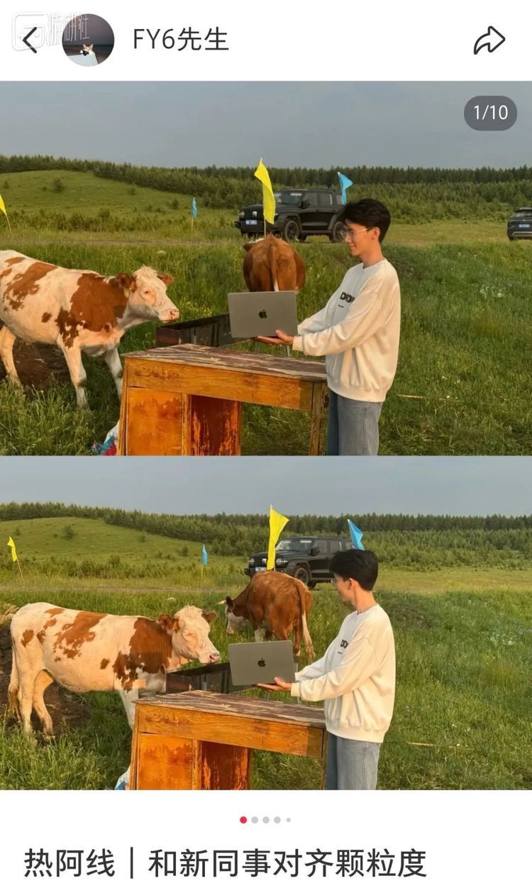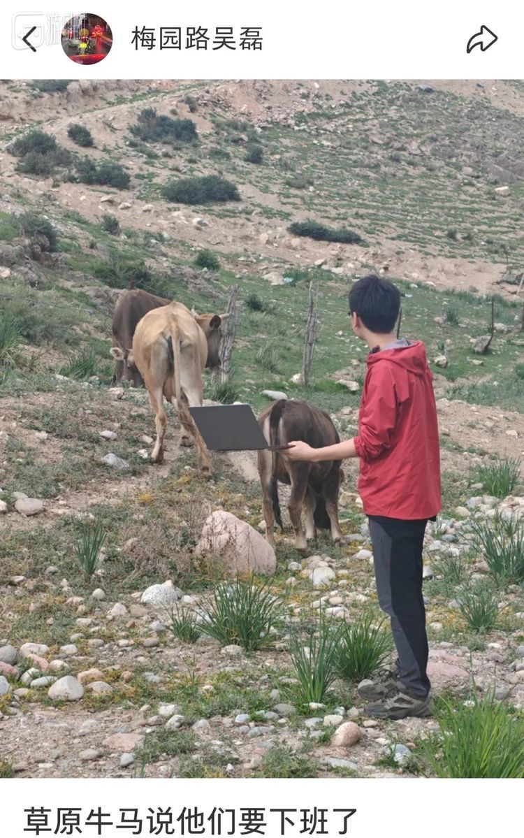 无数年轻又有创意的“牛马”们,正背着大包,在草原、牧场,默默走向真·牛马,举起手中的电脑,留下这样一张荒诞又真实的图,共同完成了一场跨物种的职场写实合影。