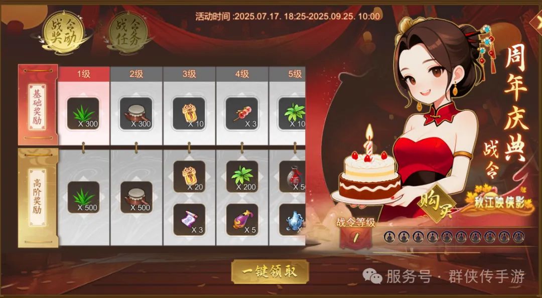 - 若尚未解锁高阶奖励,此时购买限定礼包可享受95折3688元宝(原价3888元宝)。在解锁高阶奖励的同时,额外获得周年“限定称号 <秋江映侠影>“(+6攻击、+6暴击、+6维持、+100活力)、额外战令等级;
