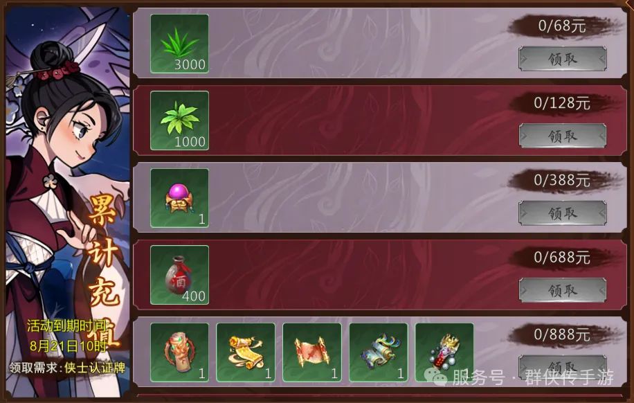 累计充值68元可获得绑定生药*3000