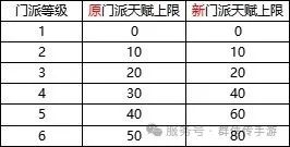 门派天赋系统拓展:天赋等级上限从 50 级提升至 80 级,且门派等级对应的天赋上限也做了调整。例如,原 4 级门派对应的天赋上限为 30 级,更新后提升至 40 级。