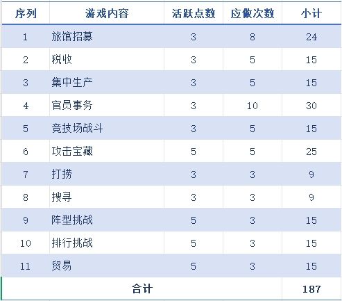 阵型挑战、排名挑战、竞技场战斗是肯定要做的,奖励同样丰厚!在线10分钟三个活动也就搞定了;银币总要打打的吧,还有贸易,所以上述这些活动是基础必做的,每天可获得187点活跃度。