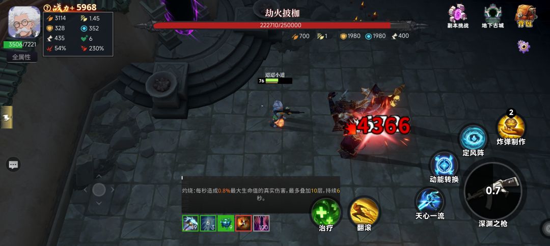 劫火披枷打法如下:转圈圈,生存能力不够的话用老头,炸弹可以回血起飞还可以无敌