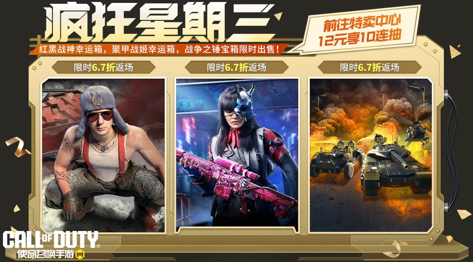疯狂星期三活动期间,战士们将享受6.7折的超值福利优惠。本次返场的三个宝箱各拥有一次特惠十连抽体验,战士们前往“特卖中心”,花费12软妹币即可十连抽一次!