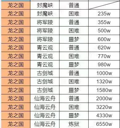以下是副本战力表