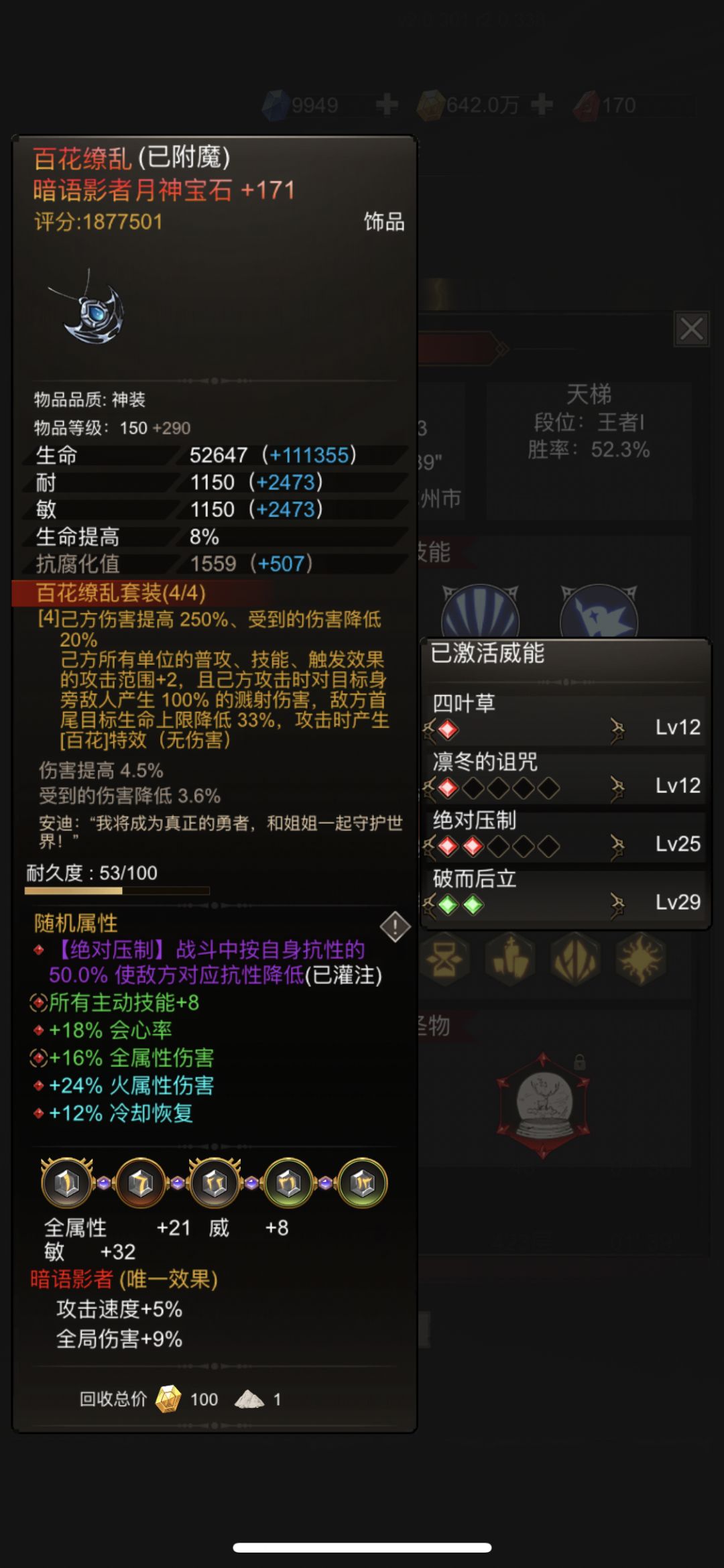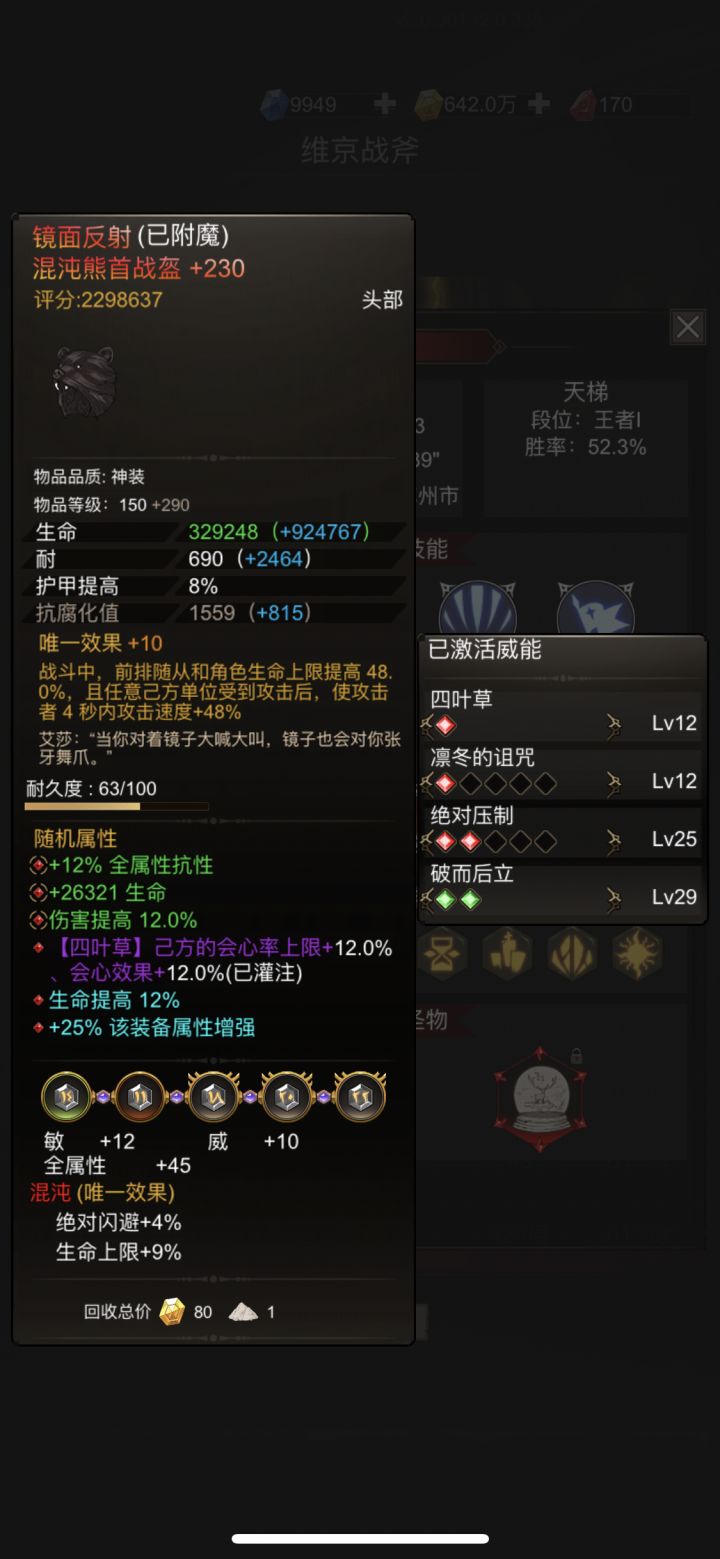 经过轮回不停试错,第四火上暴虐,暴击97,攻速能出尽出,最后堆冷却,冷却面板在185可以6秒回转石肤,连带打击只是用来炸无头最后一点血,武器带就行,对等级没要求。