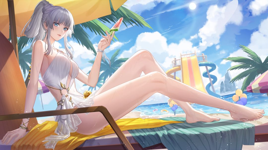 银发少女在沙滩躺椅上惬意享受冰品,不远处水上浮圈载着灰蓝衣酷姐,粉发少女追着浪花蹦跳,这个夏天是如此清爽呢!一起来享受这场热烈的夏日派对吧!