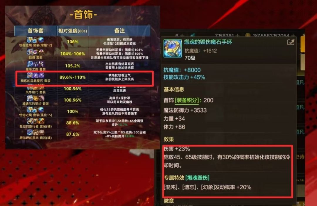 戴上超凡,手镯的三个核心效果(混沌、遗忘、幻象)触发概率直接飙升20%!技能刷新频率哐哐往上涨。精炼基础伤害其实只比常规首饰套低一点,但换来的无限重置效果简直逆天!