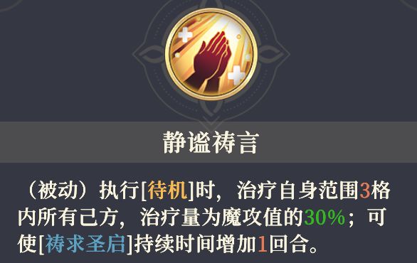 祷求圣启每次获得只能持续一回合,携带技能“静谧祷言”时,祷求圣启的持续时间会从一回合变成两回合。