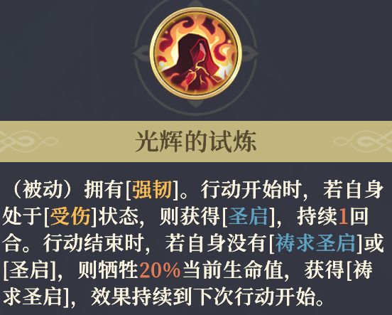 3.携带技能”光辉的试炼“且行动回合结束时身上既没有圣启也没有祷求圣启