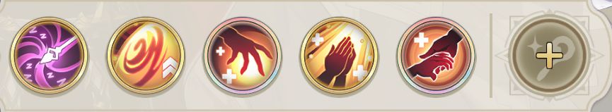 技能携带理由:扶危济难的自动治疗周围队友并施加伤害2和攻击2补足了仁光抚照缺乏的治疗量和增伤能力,静谧祷言让专武的一次待机可以提供两回合圣启降低了专武星级上的压力并进一步提高治疗量,如果有满星专武的话这个技能可以换成圣迹再临。