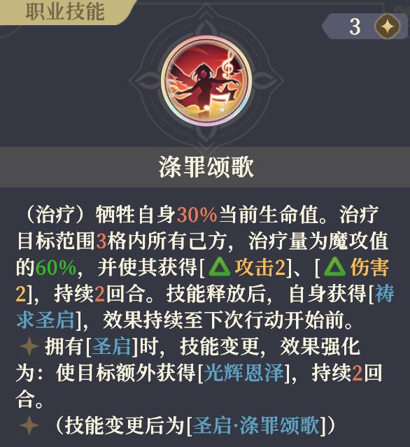 减CD流不再使用技能涤罪颂歌而是使用一阶技能“仁光抚照”来为单体队友减2回合CD,由于仁光抚照不能像涤罪颂歌一样直接获取祷求圣启,这种流派必须通过其它方式来维持圣启形态。