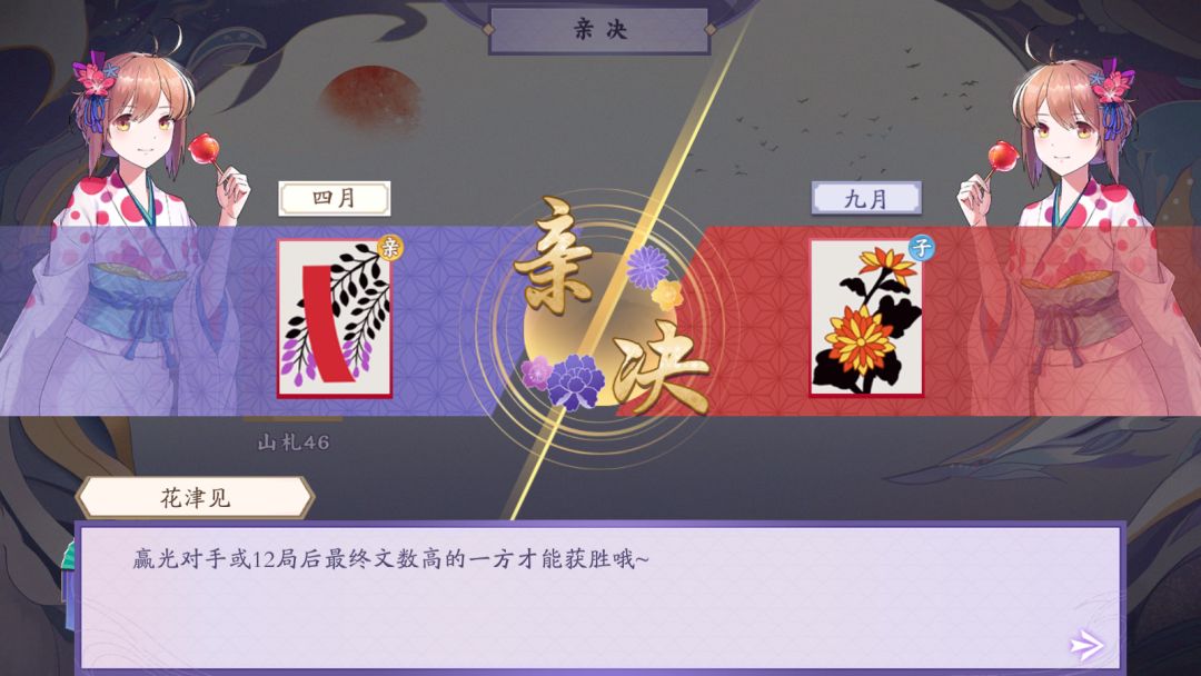 当然,《花札物语》会自动帮助玩家结算,所以不用太过担心算不清楚~12局游戏结束后,总分高于起手300文的玩家判为胜,低于起手300文的玩家判为负。