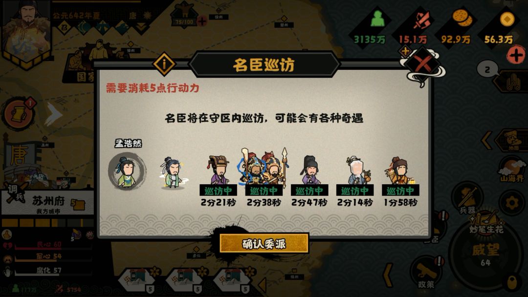 然后选几个还没挖专属文物的名臣带进来,先去有自己专属文物的城巡访,不知道位置的可以先在装备栏看一下,地图上刷新的名臣也可以招募进来当苦力。专属文物是4级城以上必出的,施行完要求的名臣政策后就开始挖掘了,这个过程必须在大地图等待。挖完之后可以再去其他有普通文物,并且有巡访次数的城市巡访。
