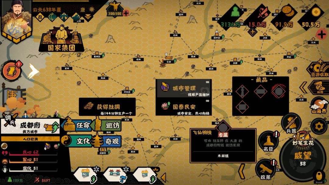 首先用大唐开始一局游戏,难度选择普通就行,名臣先不要带,进去之后,先把所有城池的建筑都整理一下,能造民生建筑的都改造民生建筑,然后一键升级,没这个功能的在设置里打开。左侧的事务栏可以快速给能升级的城池升级,有些城市获得新的土地就照旧尽量造民生建筑,没事做的时候可以在政策界面等待,等所有城市都升到4、5级之后就出去云存档。