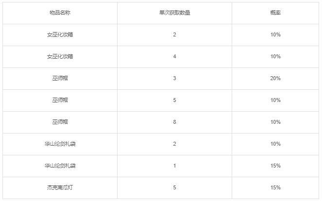 2、可抽取:女巫化妆箱、巫师帽、华山论剑礼袋等超值大奖,100%中奖率!