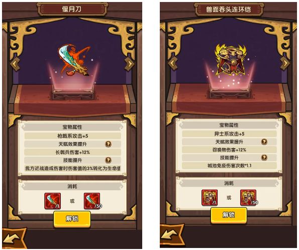 2、宝物分为橙色宝物和红色宝物,橙色宝物有基础属性加成和天赋技能(提供兵种伤害加成。),而红色宝物则额外还有一个宝物技能