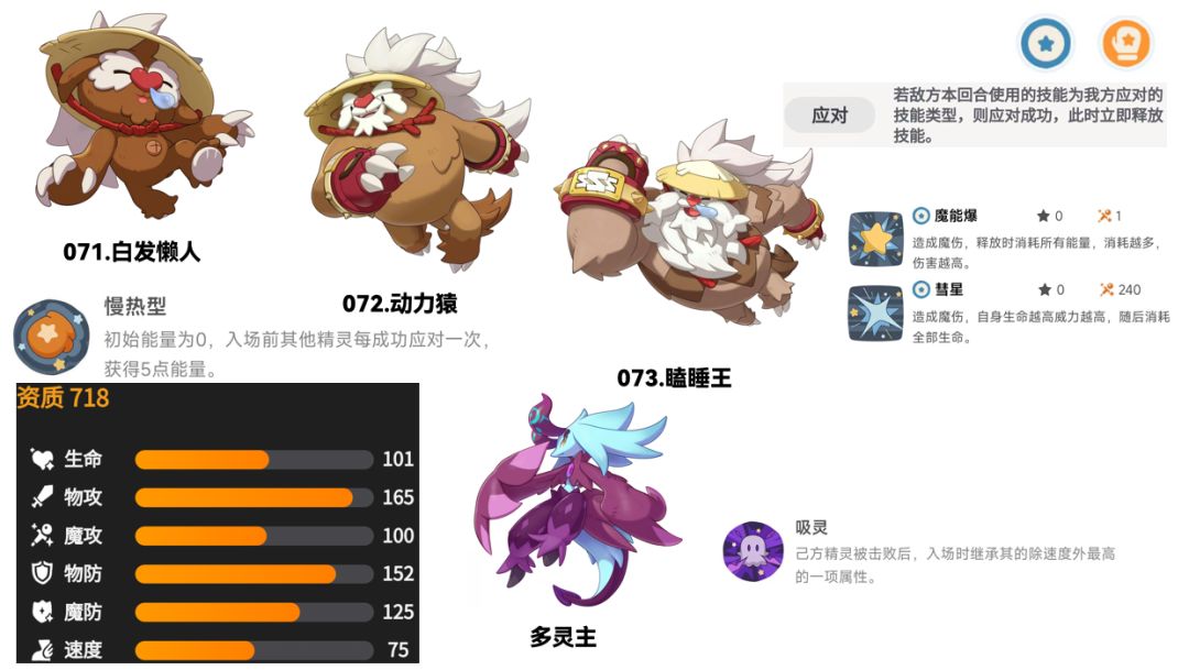 特性慢热型:初始能量为0,入场前其他精灵每成功应对一次,获得5点能量。