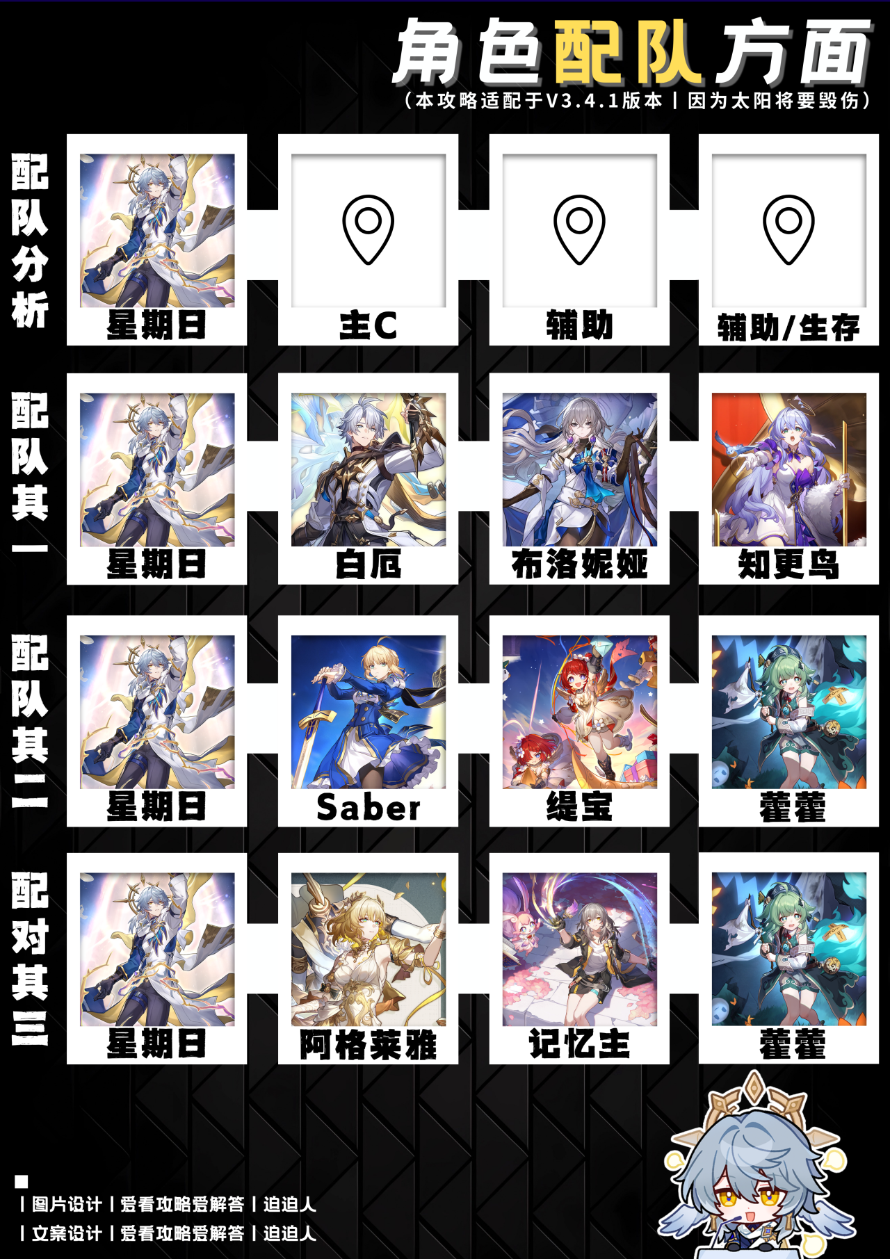 Saber作为这套队伍的C位,主要以终结技开后继续追伤,所以最大的问题谁来给Saber提供大招的充能和立即行动的问题呢?星期日就有出场的机会了,另外可选择缇宝作为全队的追伤拐同时提供穿透伤害,而藿藿主要负责治疗,解控,充能以及全队增伤,属于是治疗圈系列性价比非常有特色的奶妈。(优点:适合长轴作战,有伤害有容错,足够的生存空间和解控;缺点:需要补充一定的命座,建议给缇宝上一命,C位输出效果可以更高)