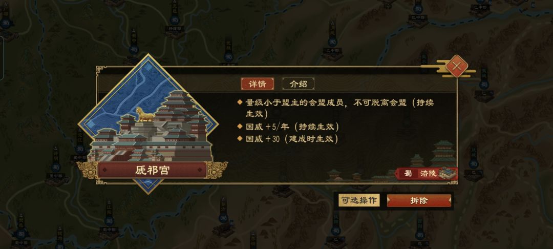 其他国家加入会盟后,有很多因素会导致他们主动退出,这时候就需要到图五,“虒祁宫”。如果AI国家抢先建造了怎么办?1.打下来;2.毁掉,让自己建,方法就是跟AI国家换城,换有虒祁宫的城池,然后得到的一瞬间毁掉(不然城池有几率叛回去),之后你再重建即可。